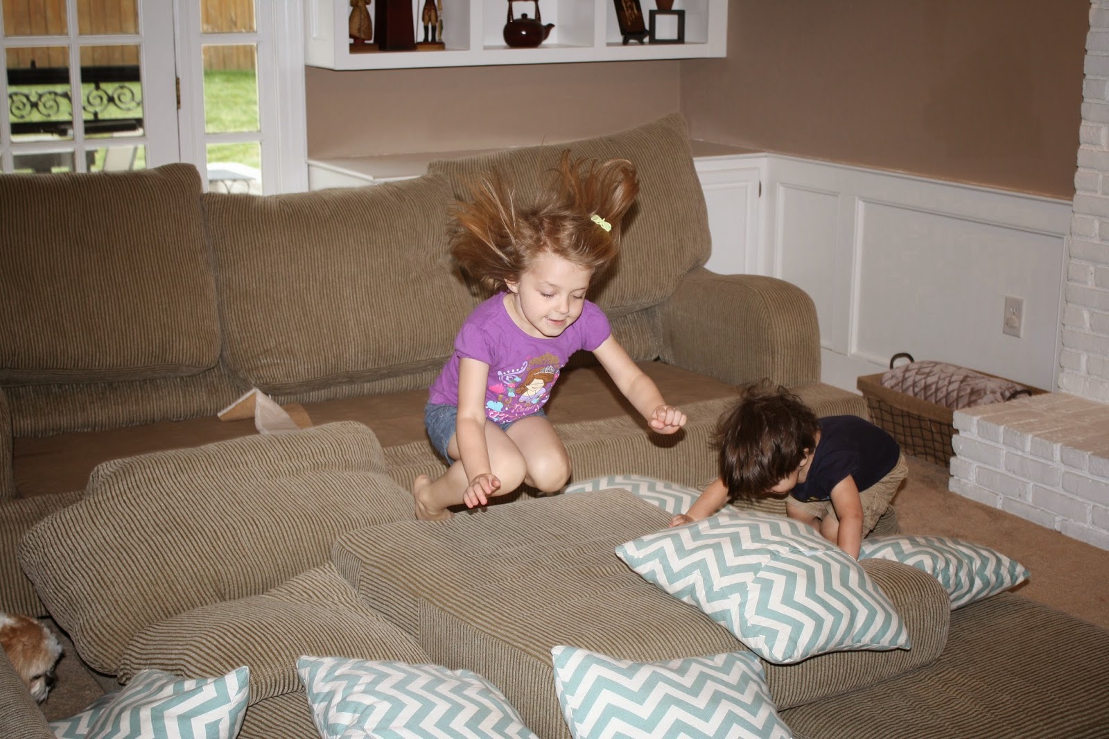 What to do on a rainy, gloomy day? Why, take all the cushions off the couch and jump on them, of course!
